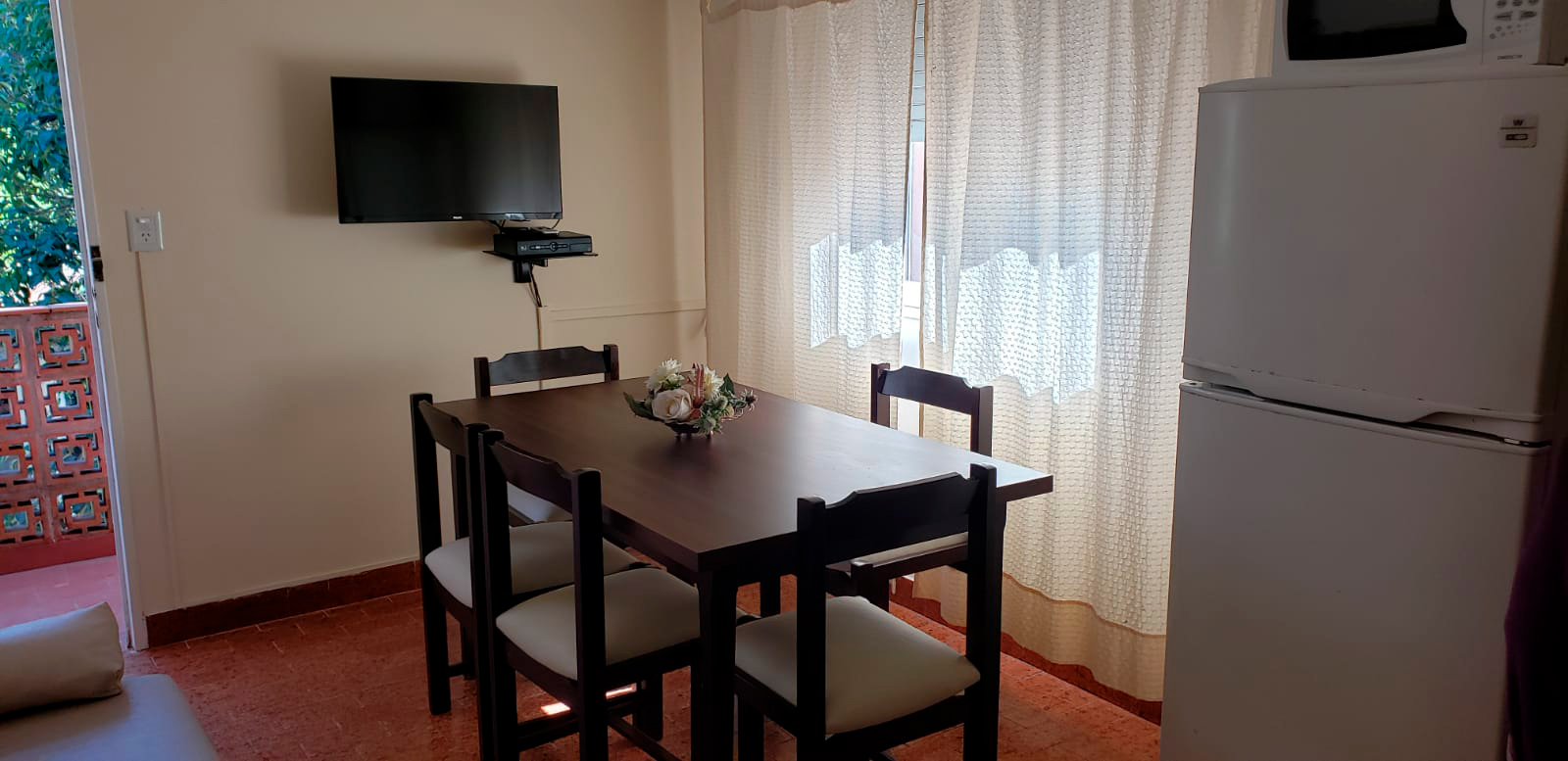 Departamentos 3 Ambientes. Apto 4/5 personas. 4 deptos en el edificio. Muy bien ubicados, A 600 m de Bunge y Libertador y 800m de la playa. Todos al exterior con persianas de madera y mosquiteros. Un dormitorio con cama matrimonial, otro con dos camas de 1 plaza (+ carrito o silloncama en el comedor p/el de 5 pax), baño, cocina comedor. Equipado con TV de 32 pulgadas, microondas, calefactor, ventiladores en las habitaciones. Cocina completa. Ropa Blanca a pedido con cargo. Parque, parrillas, mesas, sillas, reposeras y sombrillas, en area comun. Luz, gas, Direct TV y Wifi incluidos. No aceptamos grupos de jovenes ni mascotas.